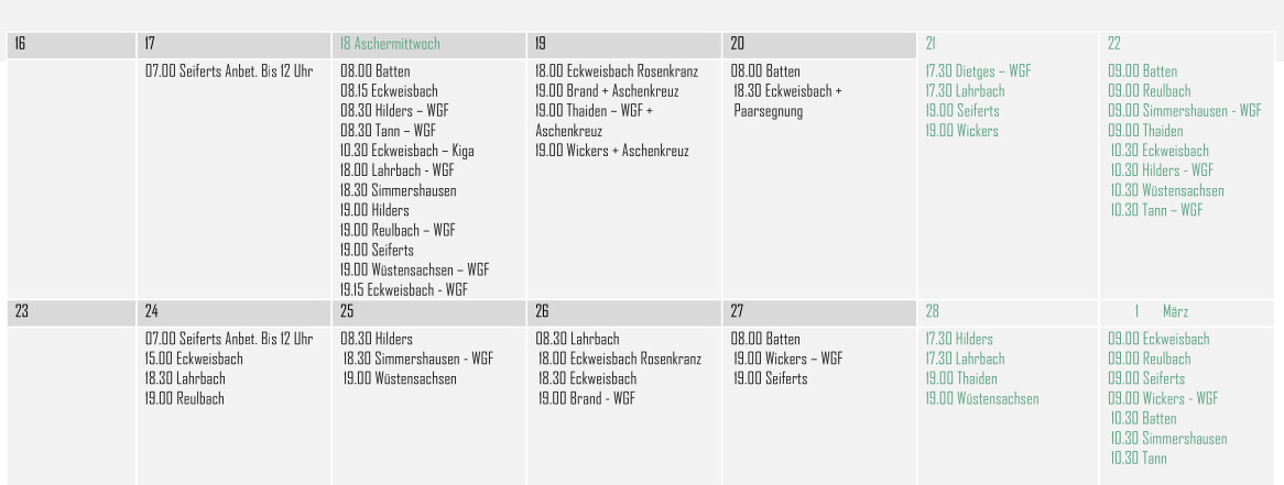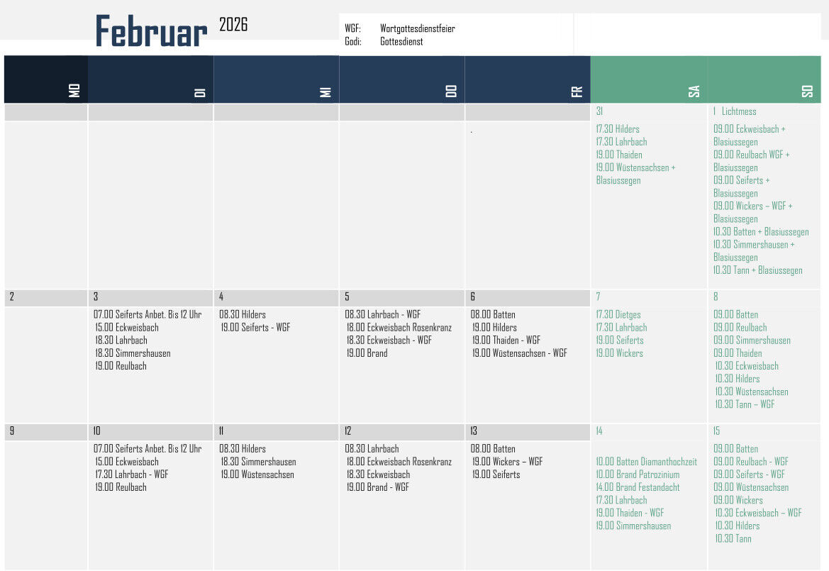 Der folgenden Aufstellung können Sie entnehmen, wann in den einzelnen Orten im Pastoralverbund Gottesdienste gefeiert werden.