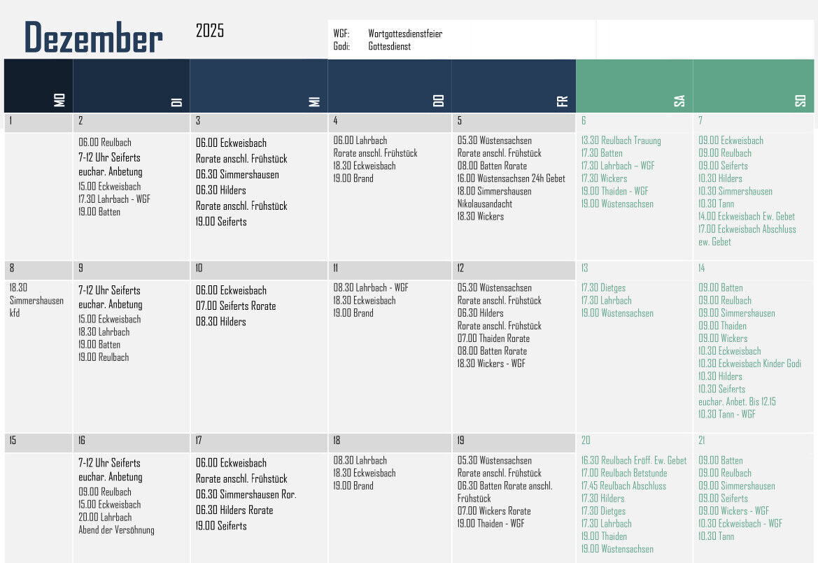 Der folgenden Aufstellung können Sie entnehmen, wann in den einzelnen Orten im Pastoralverbund Gottesdienste gefeiert werden.